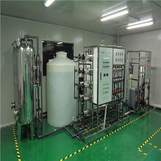 原水从原水箱出发,经原水泵增压后送至多介质过滤器到活性炭过滤器。多介质过滤器能有效地达到截留微粒、悬浮物、胶体等功效,满足反渗透装置运行的要求。多介质过滤器出水再进入活性炭过滤器对水作进一步过滤,以除去水中的有机物及余氯。经过净化的原水通过保安过滤器的屏蔽有效地避免细小微粒伤害反渗透膜。通过保安过滤器的水,经高压泵的增压进入反渗透系统,反渗透的产水送入纯水箱,纯水箱的纯水经纯水泵送入用水点。